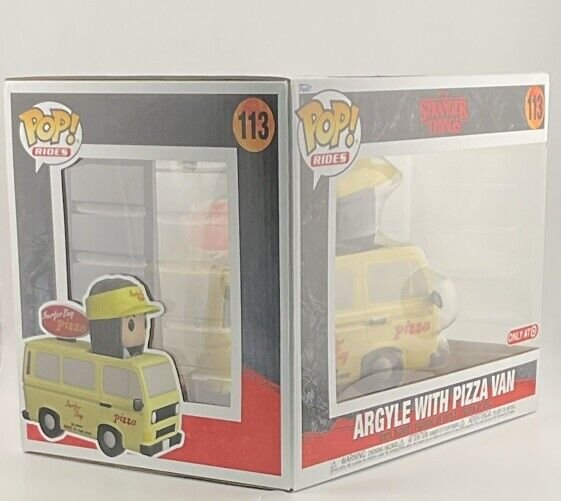 Introducing the Funko Pop 2022 Rides Stranger Things Argyle With Pizza Van #113 Target Exclusive vinyl figure! This highly collectible item is a must-have for fans of the popular TV show Stranger Things. The figure features Argyle with a pizza van and is made of high-quality vinyl material.