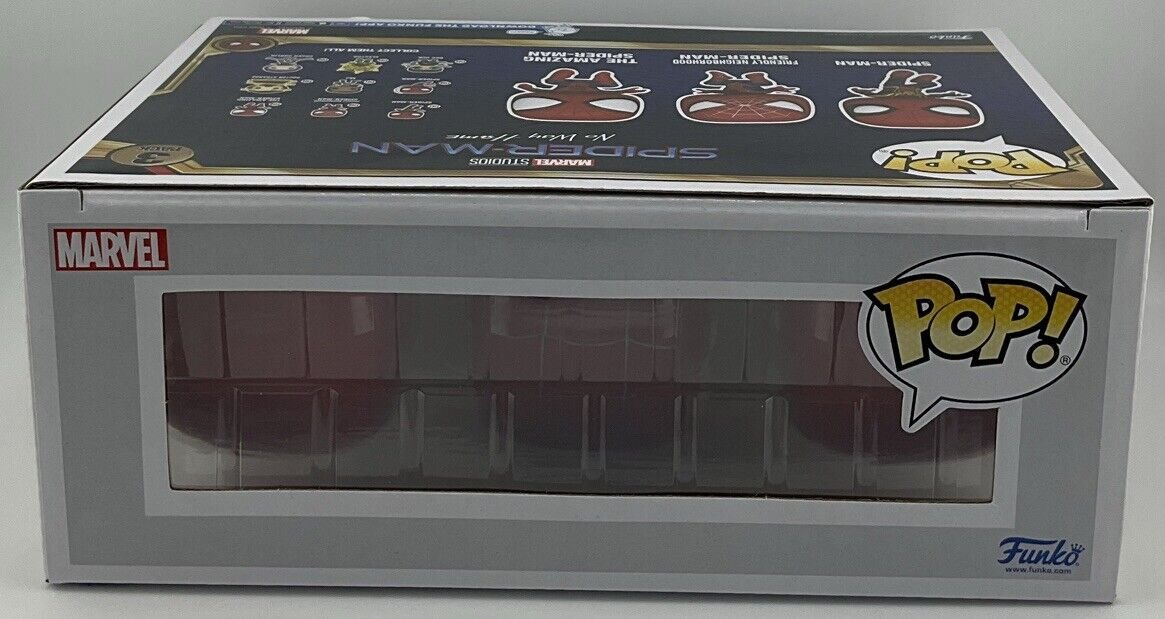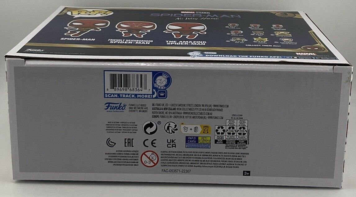 Introducing the Funko Pop No Way Home 3-Pack featuring your favorite characters from the hit movie, Spider-Man: No Way Home. This exclusive and multipack collectible figures set is a must-have for any Marvel fan. The set includes Spider-Man, Friendly Neighborhood, and The Amazing Spider-Man characters, portrayed by Tom Holland, Tobey McGuire, and Andrew Garfield respectively.